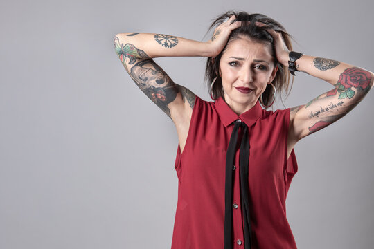 ragazza  mora con i tatuaggi indossa una camicia senza maniche rossa, porta le mani alla testa in segno di disperazione,  isolata su sfondo grigio