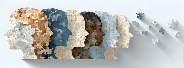 Forme diverse di teste umane. La gente comporre la testa fatta a puzzle con pezzi mancanti. Concetto di identità delle persone - Illustrazione vettoriale