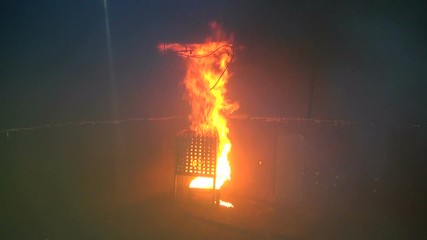 Bright and dangerous fire in the hold. Fire tests in a closed room. Flames of fire and black smoke. Strong fire high danger level. Black smoke from a fire.