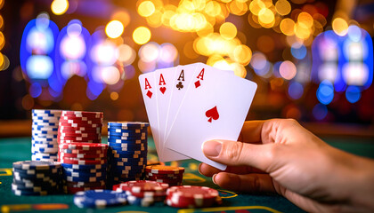 Close-up of a hand holding pocket aces in a poker game on green felt.