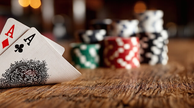 Casino gaming scene with poker cards and stacks of chips on a green felt table.