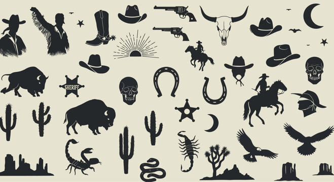 A vintage wild west illustration featuring cowboys, cacti, and desert elements, perfect for western themes and rustic designs isolated on white background