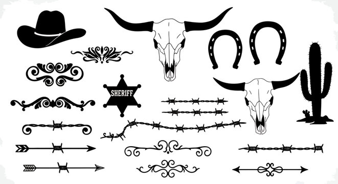 A collection of vector graphics featuring a cowboy theme, including a hat, horseshoe, bull skull, cactus, sheriff badge, barbed wire, and decorative elements, perfect for design.