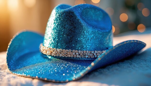 Blue sequin cowboy hat with crystal band rests on soft surface. Hat shines under warm light, perfect for country music, western events, parties, and fashion accessory themes.