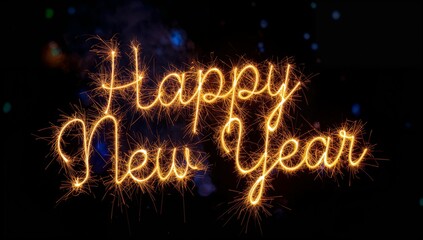 Glowing cursive sparkler text forming Happy New Year at night, with sparks ember smoke bokeh