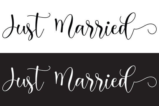 Just Married hand lettering phrase. Vector brush calligraphy text design isolated on white background.  Modern handmade calligraphy. Hand drawn lettering element for your design in eps 10.