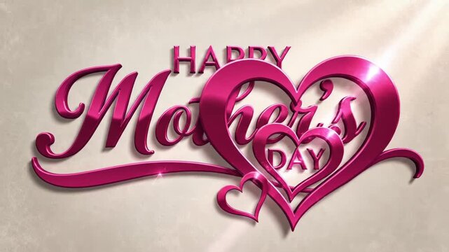 Elegant 3d pink metallic script text saying happy mothers day with a decorative swoosh on a light beige textured background