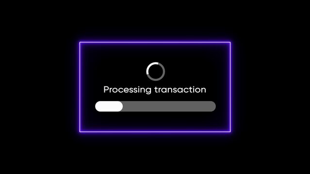 Neon purple rectangle surrounds loading bar and text processing transaction on black background progress