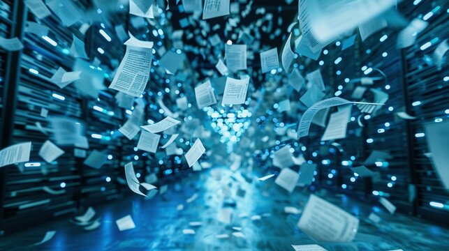Open book glows with digital data. Artificial intelligence processes info from unstructured text. Tech extracts data from docs. AI in doc analysis. Innovation in info tech. Modern tech in libraries.