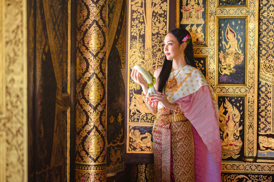 Pretty Asian Thai women holding a Krathong floating on water, Asian women in traditional Thai dress bring Krathong to float on Loy Krathong Festival Day, Popular traditions culture of Thailand.