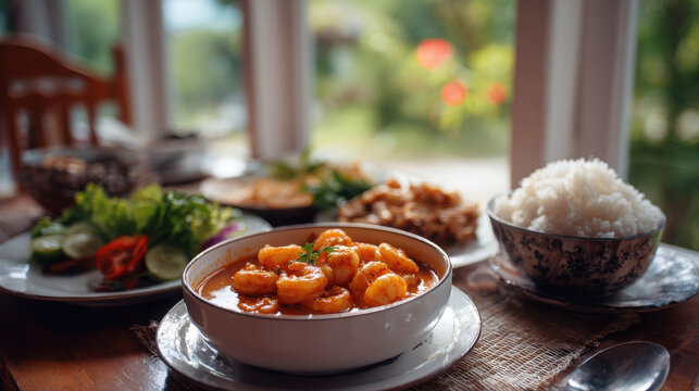 Vibrant Southern Thai Family Meal Served on Table with Fresh Ingredients and Rice in a Scenic Setting