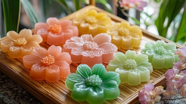 vibrant Thai breakfast catering station featuring variety of dishes, fresh juices, and tropical decor, creating delightful