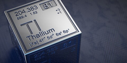 Thallium. Post-transition metals. Chemical Element of Mendeleev's Periodic Table. Thallium in square cube creative concept.