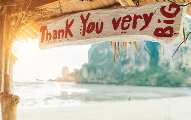"Thank You very BIG" sign in exotic bungalow on the sandy Thai beach. Tropic vacation concept image.