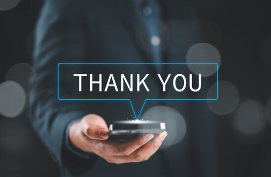 Businessman saying thank you on thanks message envelope. Thank you message, appreciation or greeting to client, customer or employee communication, gratitude letter email, calligraphy.