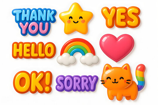 Messages of Emotion: A vector image of colorful word art displaying "thank you" "hello" "ok" "sorry" "yes", alongside expressive emoji of a smiling star, a rainbow, a heart and a cat.