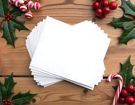 Stack of 5x7 A2 A7 white papers on a desktop for stationery mockup notecards thank yous envelopes graphic design resource with christmas decorations and objects