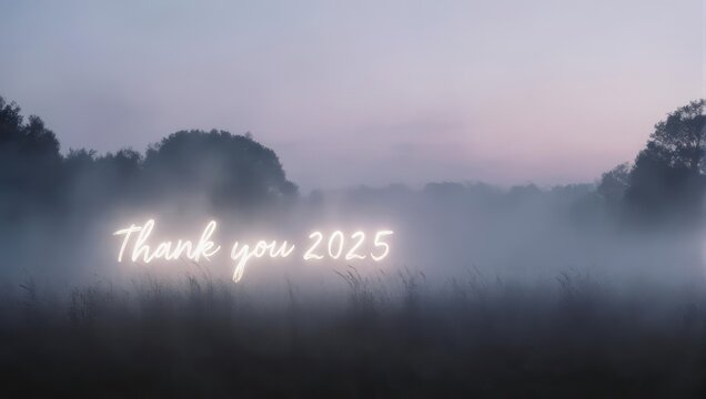 Thank You 2025 Glowing Text in Misty Landscape at Dusk.