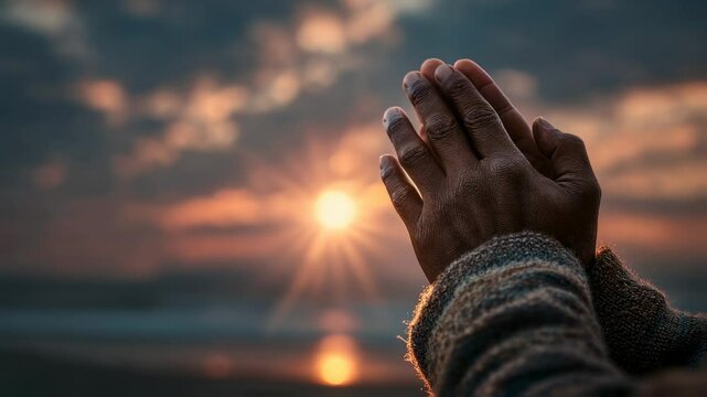 Hands clasped in prayer against a backdrop of a tranquil sunset sky, invoking serenity