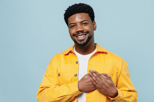 African American girl appreciate friend support being touched with kind words holding hands on heart smiling broadly with grateful happy expression standing pleased and joyful over gray background