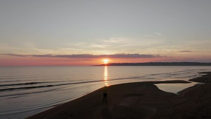 Flying over one man standing at beach shore looking at calm ocean during a peaceful sunset, Kavouri sand beach, Katakolo, Elis province, Aerial