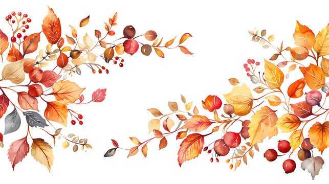 Hand drawn autumn horizontal banner with falling leaves, acorn and berries. Vector illustration in sketch style isolated on white. Space for text. Hello Autumn