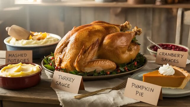 Thanksgiving dinner spread with turkey, pies, and autumn decor on wooden table