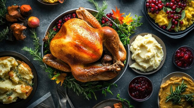 Top view of a festive Thanksgiving dinner spread with a roasted turkey, mashed potatoes, gravy, and cranberry sauce