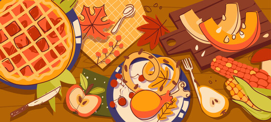 Cozy thanksgiving dinner spread with pumpkin pie, roasted turkey leg and corn for autumn celebrations or harvest festivals. Apple slices, pear and maple leaves on wooden table. Seasonal feast.