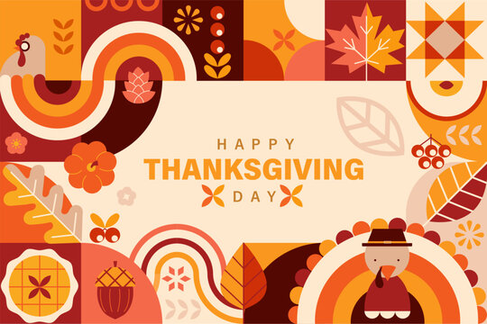 Happy Thanksgiving Day banner with geometric symbols of holiday-turkey,pumpkin,pie.Thanksgiving Autumn harvest sale 2024. Autumnal festive.Template for promotion,web,cards,flyers, posters,ad.Vector