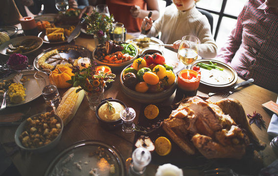 Family sharing meal at thanksgiving celebration dining table