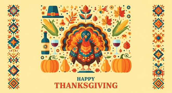 Vibrant and festive illustration celebrating thanksgiving with a central ornate turkey surrounded by harvest elements pumpkins corn wine and decorative borders conveying warmth and gratitude