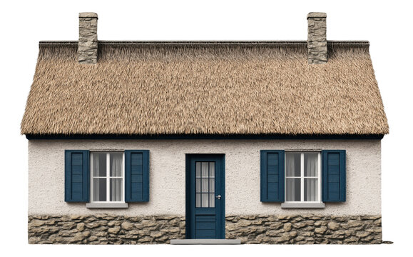 Quaint countryside cottage with thatched roof, apple tree, ivy walls, smoke chimneys, and “Home” sign in lush green rural landscape