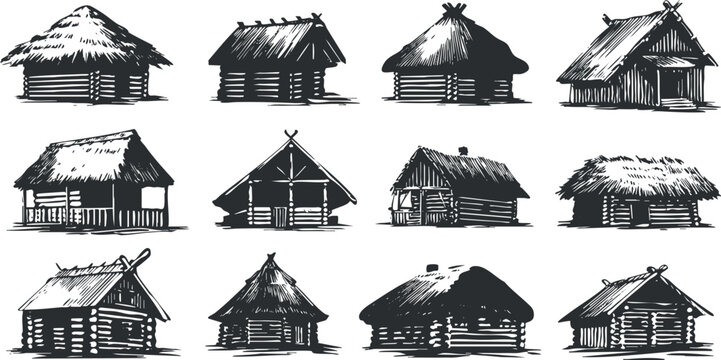 Hand-drawn vector collection of rustic wooden huts and houses with thatched roofs for architectural and design projects