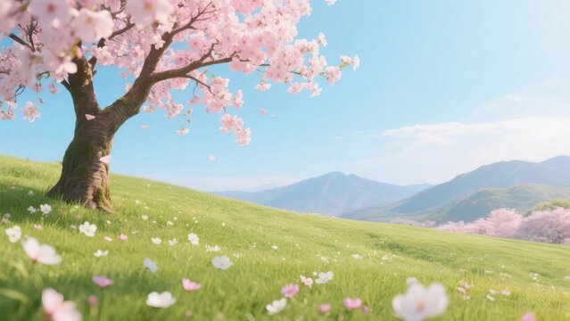 Verdant Hill Blooming with Yellow Flowers in Spring. 3D render.