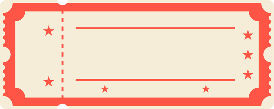 Retro blank admission ticket template with red border, perforation and star icons. Empty coupon for cinema, theater, or raffle events. Flat style. Editable vector illustration.