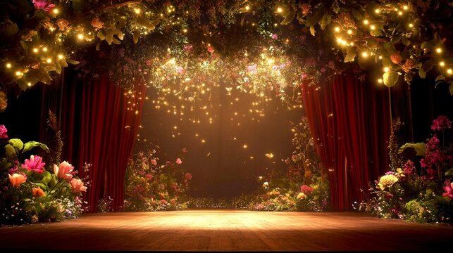 A vibrant stage adorned with blooming flowers and twinkling lights invites creativity. Perfect for theater productions or artistic showcases. Bright colors evoke joy and inspiration. AI
