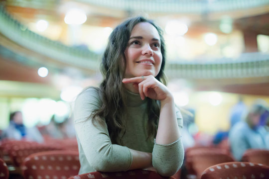 Portrait of  glad smiling woman satisfied theatre