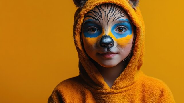 Adorable and curious young boy wearing a colorful furry animal costume with a playful and expressive facial expression on an orange background in a studio setting