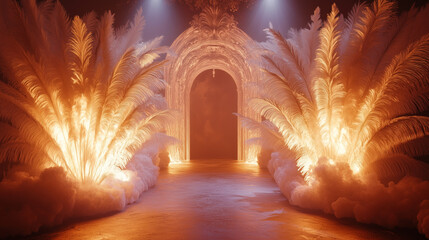 Luxurious burlesque backdrop with glowing golden feathers and ornate archway, perfect for theatrical performances, vintage cabaret, and glamorous stage design
