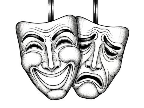 Two theatrical masks, one smiling and one sad, representing comedy and tragedy