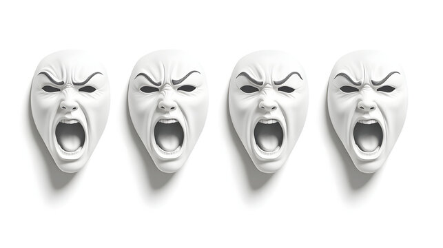 Set of four white theatrical masks expressing intense emotions for dramatic art concepts