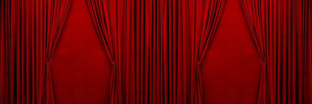 Dramatic purple theater curtains open on a spotlighted wooden stage