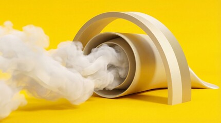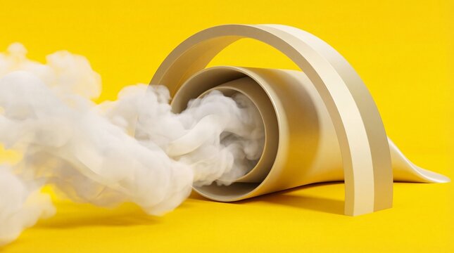 Abstract visual representation of dense white vapor streaming out from a beige spiral form against a vibrant yellow background creating dynamic motion and contrast