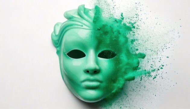 Mint colored theatrical face covering disintegrates into fine powder on a white background