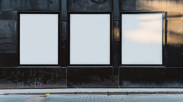 Thee empty advertising billboards on the wall of building