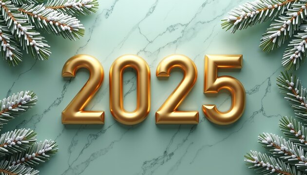 Golden 2025 numbers with snowy pine branches on green marble, New Year celebration design