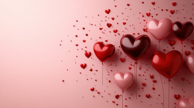Fondo temático de San Valentín corazones rojos y colores pasterl con espacio para texto y confetis de corazones