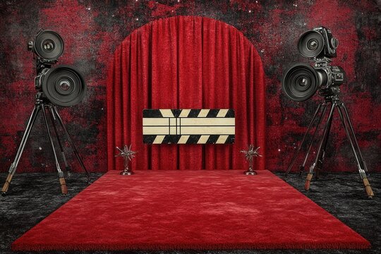 Cinematic Stage Setup with Red Carpet and Cameras for Film Events and Photography