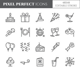 Birthday party theme pixel perfect thin line icons. Set of elements of cake, present, champagne, disco, firework and other entertainment related pictograms. Vector illustration. Editable stroke